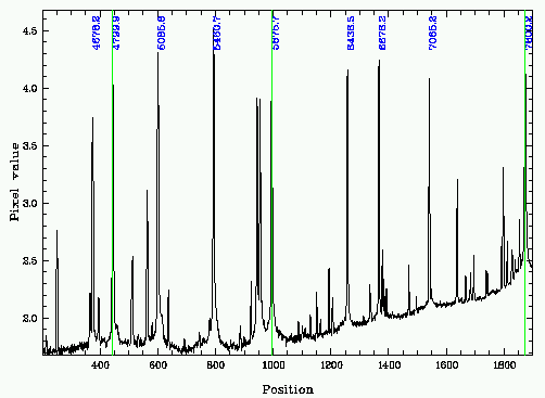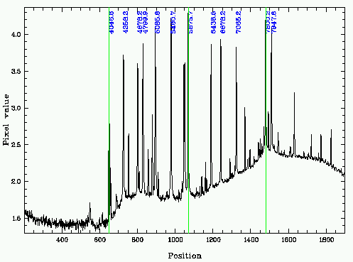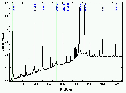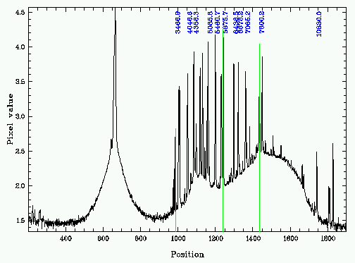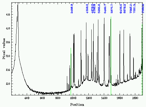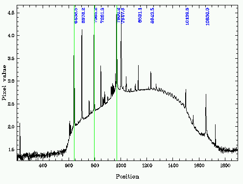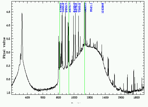 | Function: | The procedure automatically finds the brightest spectrum (but you can select another one interactively), subtracts the night sky and extracts the 1 dimensional spectrum (Horne algorithm). After that a standard wavelength calibration is applied. |