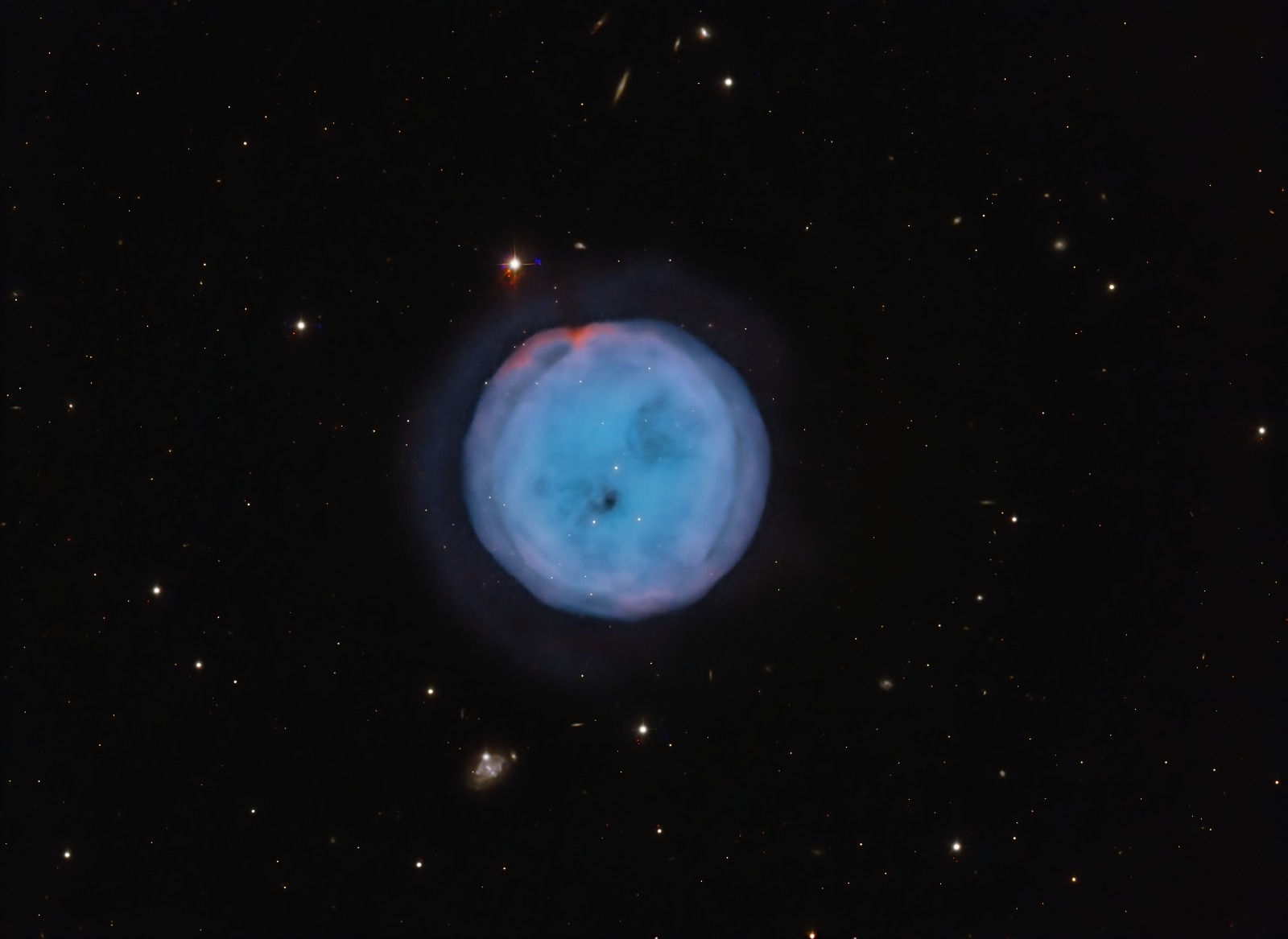 Field of about 13’x10’ centered on the planetary nebula Messier 57 (incl. the spiral galaxy IC1296). Combination of 9x300 s exposures in Halpha and 9x300 s in [OIII] with the ASI461MM Pro. The red artefacts around bright stars are internal reflections due to the Halpha filter (655/16) used.