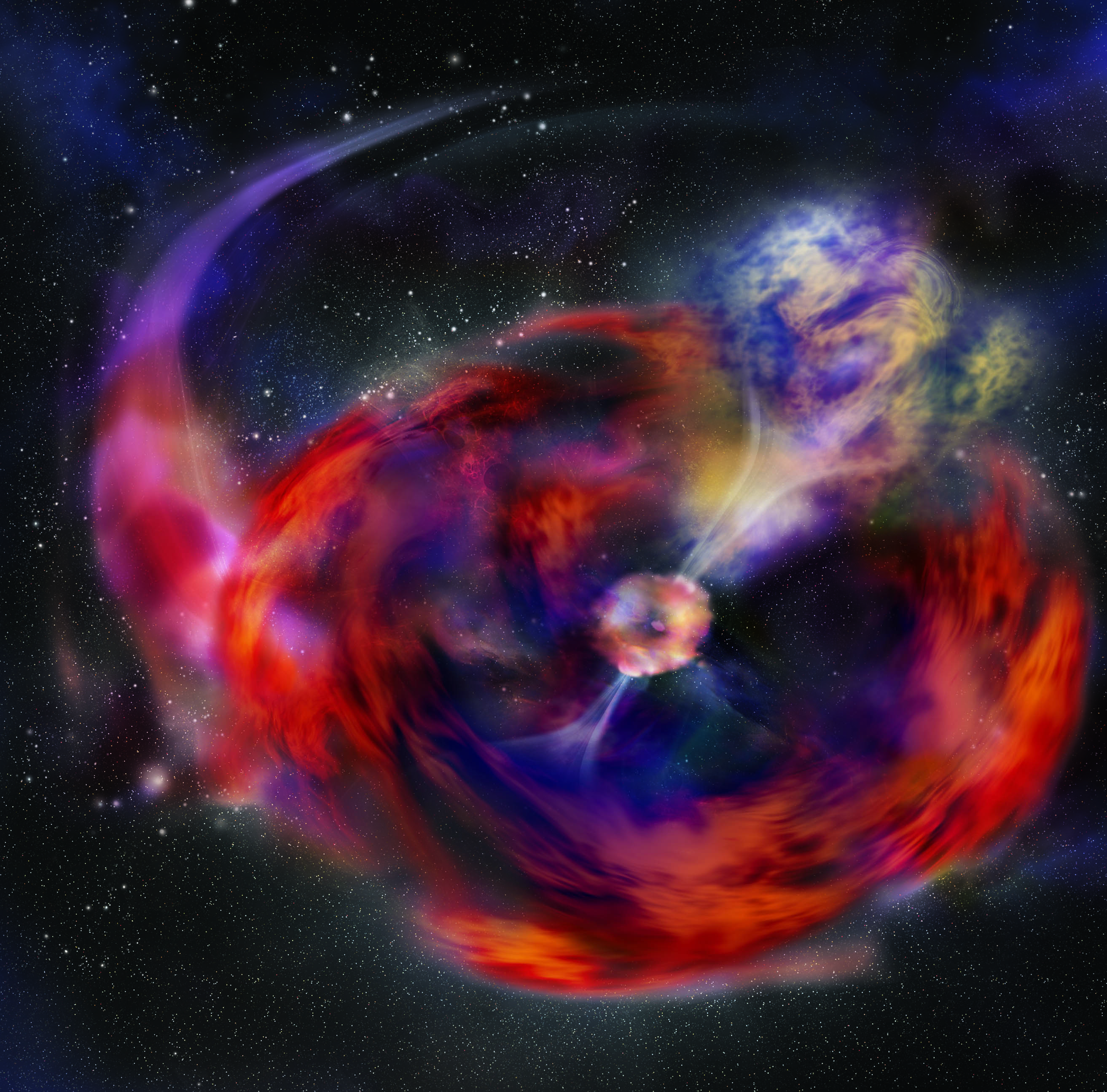 | Impresión artística del proceso que desencadenó la Explosion de Navidad, el GRB anómalo GRB101225A. A. Simonnet, NASA E/PO, Sonoma State University.