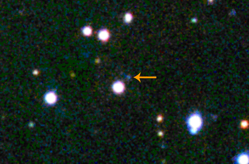 | La fuente de luz visible correspondiente a GRB101225A, observada con el reflector Zeiss de 1.23 m del Observatorio de Calar Alto, aproximadamente un día tras la explosión. Obsérvese su tono azulado, atípico para el resplandor ulterior de los GRB estándar. Este color puede explicarse como procedente de una fuente térmica con una temperatura de unos 21 000 K.