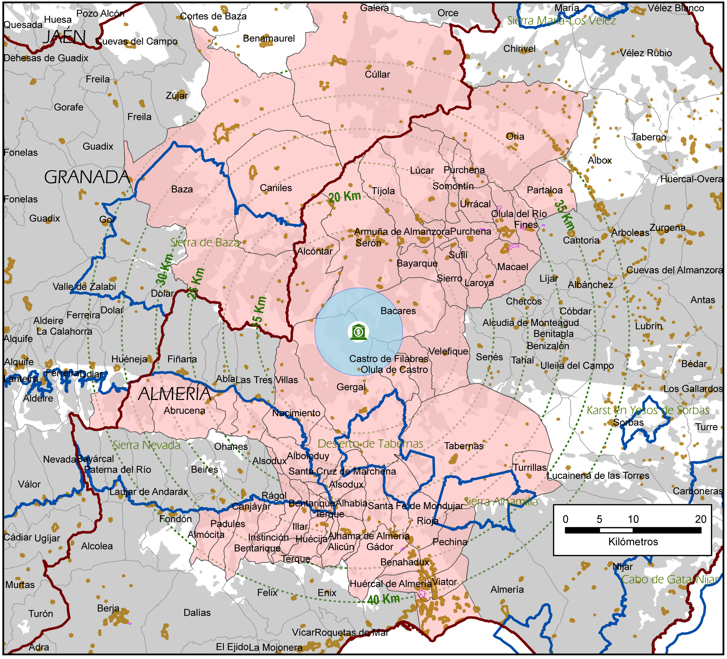 Mapa con la delimitación de la zona de influencia del Observatorio de Calar Alto para la protección de su cielo frente a la contaminación lumínica: áreas Z1 (azul) y Z2 (rosa).