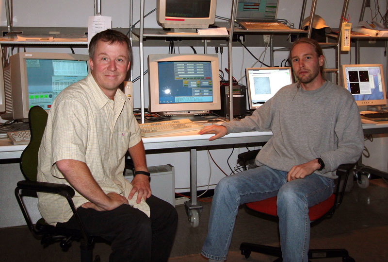 Stefan Hippler y Felix Hormuth en la sala de control del telescopio (102.9 KB)