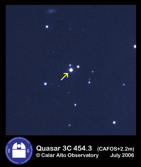Calar Alto participa en un programa multi-observatorio para el estudio del cuásar más luminoso jamás observado. El objeto, el radio-cuásar 3C 454.3 en la constelación de Pegasus, experimentó durante el año 2005 un brote de emisión en el visible que lo hizo observable incluso con instrumentos de aficionado (alcanzó R = 12 mag). Según el equipo WEBT, «este brote probablemente represente el estado más luminoso jamás observado en un cuásar». El mismo equipo cuantificó la luminosidad máxima del objeto como MB = -31.4 mag. Esto significa que, en el máximo y observado en luz azul, 3C 454.3 alcanzó el mismo brillo que 550 000 millones de soles juntos.