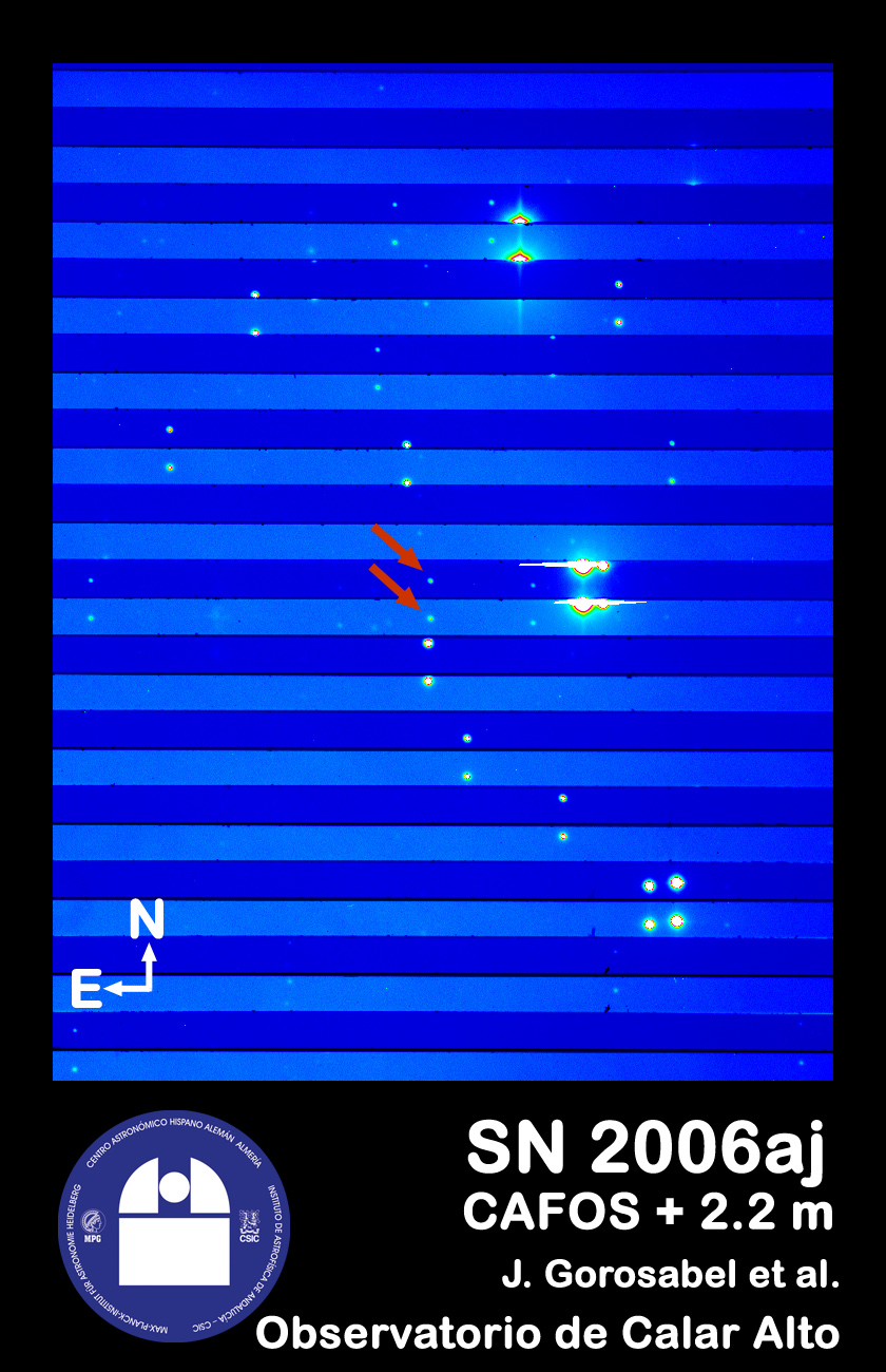 Imagen polarimétrica de la SN2006aj obtenida con CAFOS (485 kB). El instrumento CAFOS acoplado al telescopio de 2.2 m de Calar Alto produce este efecto de «barras y estrellas» cuando se emplea en modo polarimétrico: las imágenes estelares aparecen duplicadas y cada imagen individual corresponde a luz emitida en un plano de polarización diferente. La imagen doble de la supernova está marcada con flechas.