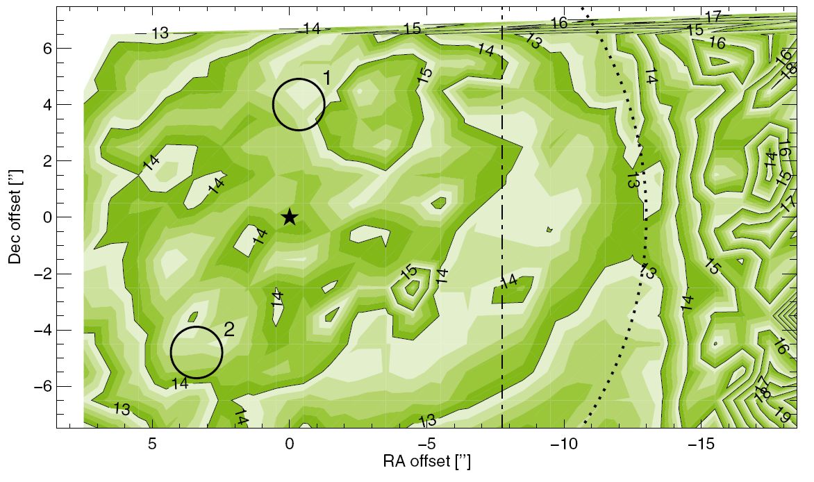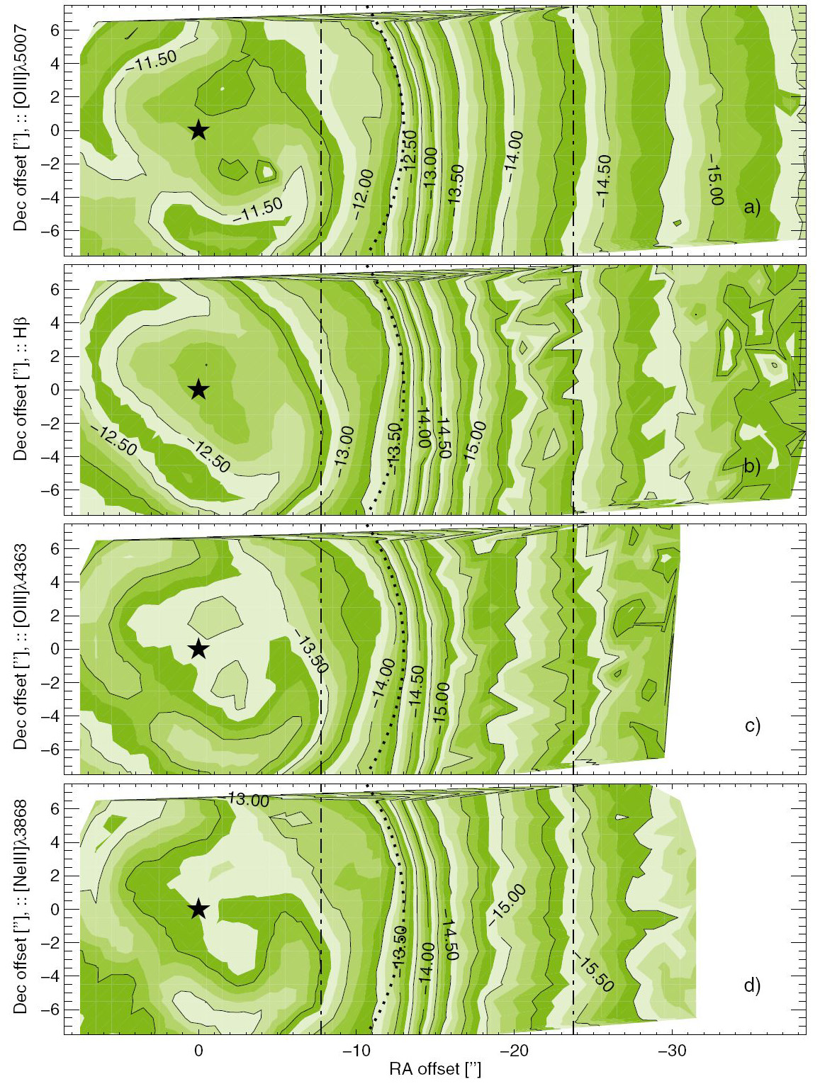 Mapa de brillo superficial de NGC 7662 en cuatro líneas de emisión (OIII a 500.7 nm , H-beta, OIII a 436.3 nm, y Ne III). La curva de puntos señala la frontera entre la envoltura y el halo. Figura 7 de A&A 486, 545-567 (2008) (633 Kb)