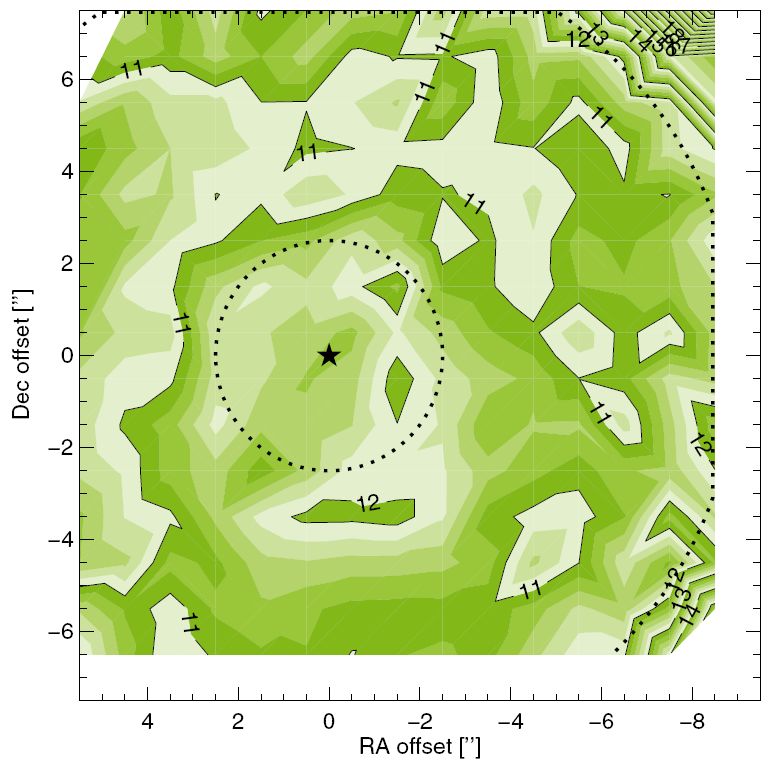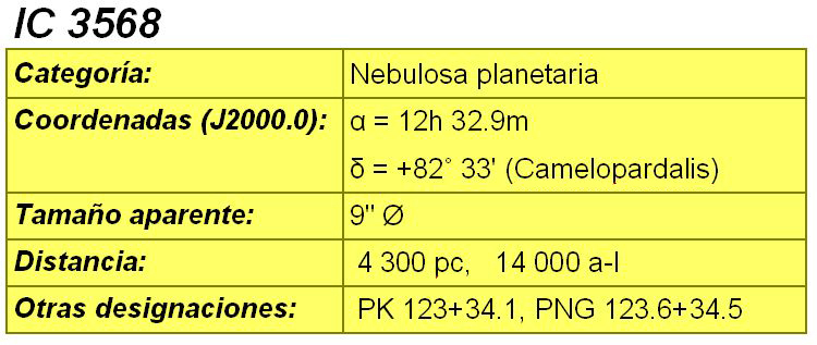 Mapa de temperatura electrónica de IC 3568 en unidades de 1000 K. La circunferencia pequeña de puntos señala el borde interior de la nebulosa, y la curva punteada externa marca la frontera entre la envoltura y el halo. Figura 13 de A&A 486, 545-567 (2008) (86 Kb)