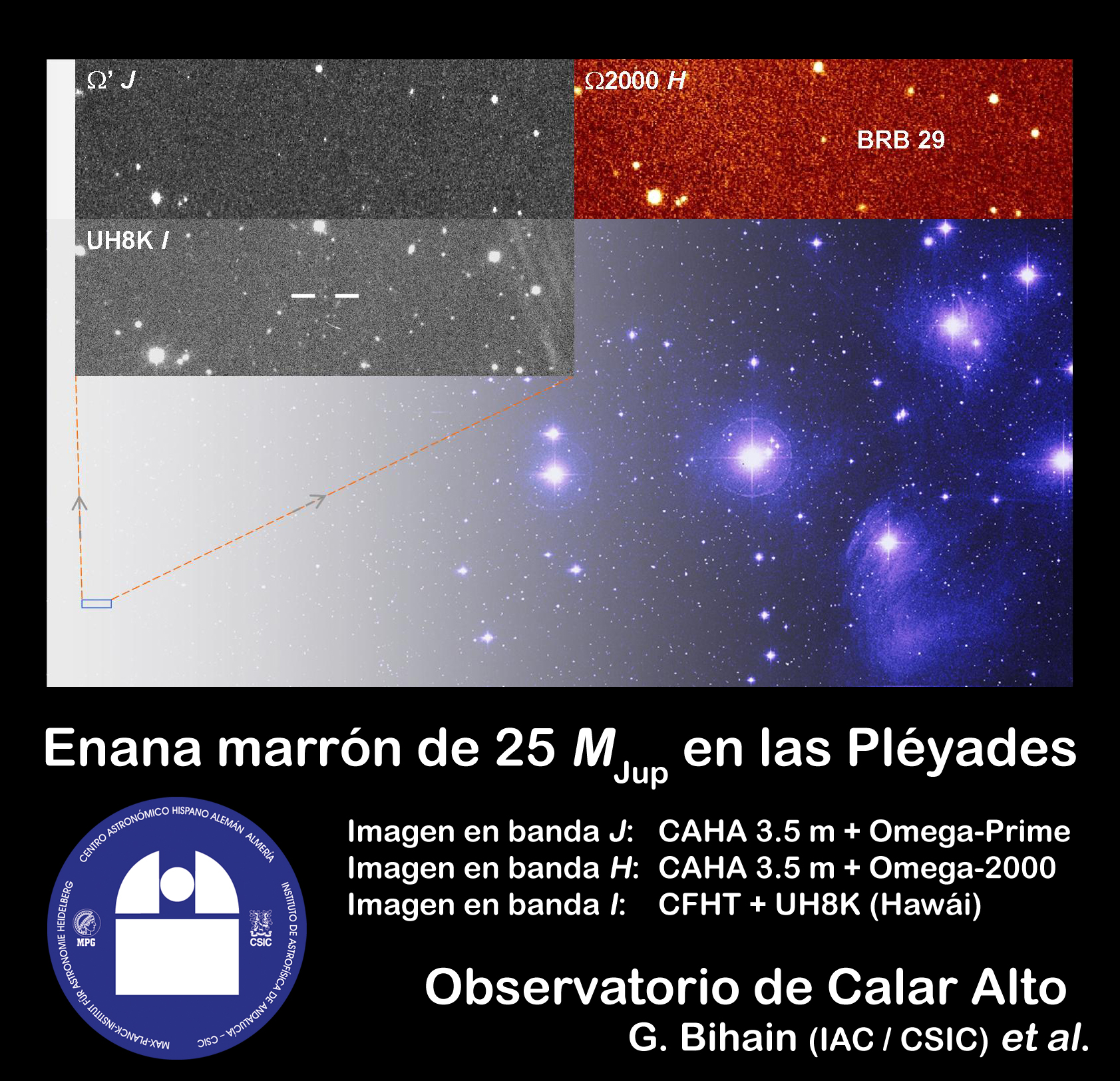 Las primeras enanas marrones libres las descubrió un equipo dirigido por el astrónomo español Rafael Rebolo en 1995, y se hallaron precisamente entre los miembros de las Pléyades en una investigación que también se basó en parte en observaciones obtenidas en Calar Alto.  El equipo de Rebolo ha cosechado desde entonces un gran éxito en el descubrimiento e investigación de la naturaleza de enanas marrones, y ahora anuncia el hallazgo de los miembros más débiles y fríos de este cúmulo. En un estudio reciente (Bihain et al. 2006) publican el descubrimiento de al menos seis enanas marrones de masas muy reducidas, tan pequeñas como 25 veces la masa del planeta Júpiter.