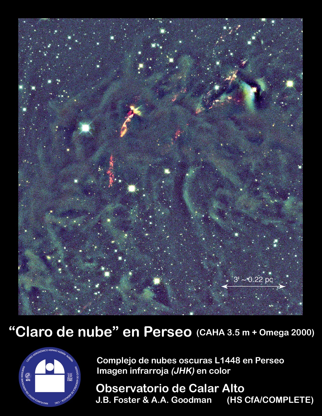 cloudshine-teaserLas nubes oscuras de gas y polvo que pueblan el espacio entre las estrellas, no son tan oscuras como se creía hasta ahora. Un estudio reciente efectuado en longitudes de onda infrarrojas muestra que algunas de estas nubes lucen, y exhiben un resplandor extenso y llamativo que probablemente se deba al esparcimiento de la luz estelar del entorno. Los autores de este estudio, Jonathan Foster y Alyssa Goodman (del Harvard-Smithsonian Center for Astrophysics, Estados Unidos) llamaron a esa nueva luz cloudshine, o sea, "claro de nube". Las observaciones que condujeron a este descubrimiento inesperado se realizaron en el  Observatorio de Calar Alto con la cámara Omega-2000 acoplada al telescopio de 3.5 m.