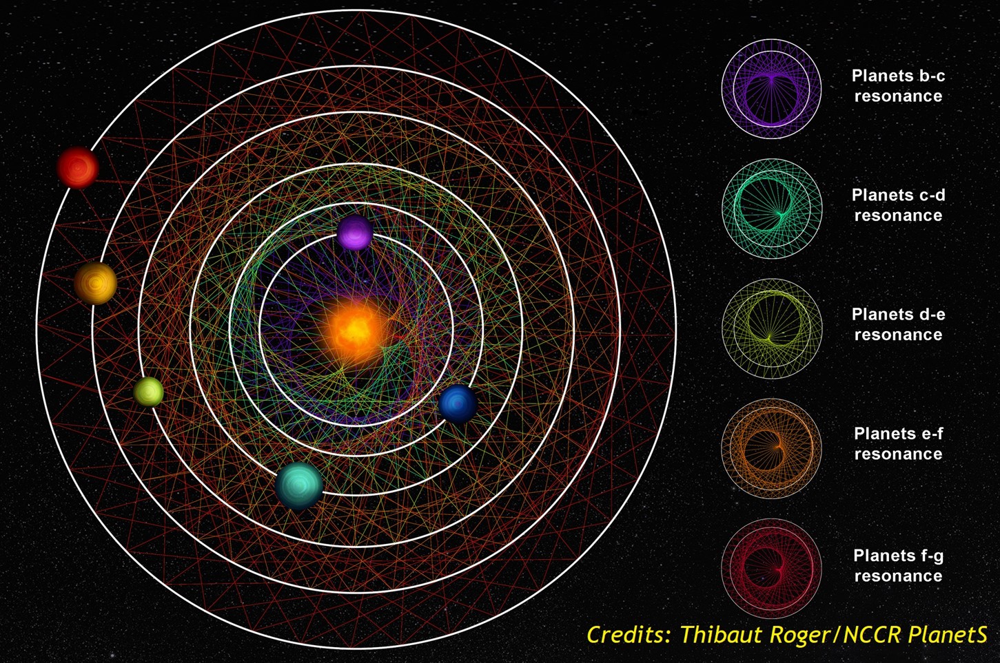 Un artículo que se publica hoy (29 de noviembre del 2023) en la prestigiosa revista Nature revela que esta estrella está rodeada por un “sistema solar” muy peculiar, detectado gracias a un cuidadoso re-análisis de sus múltiples micro-eclipses vistos desde la Tierra: cada uno de los 6 planetas descubiertos muestra una relación simple entre su período orbital y el de su vecino, siguiendo una delicada cadena de órbitas en resonancia.