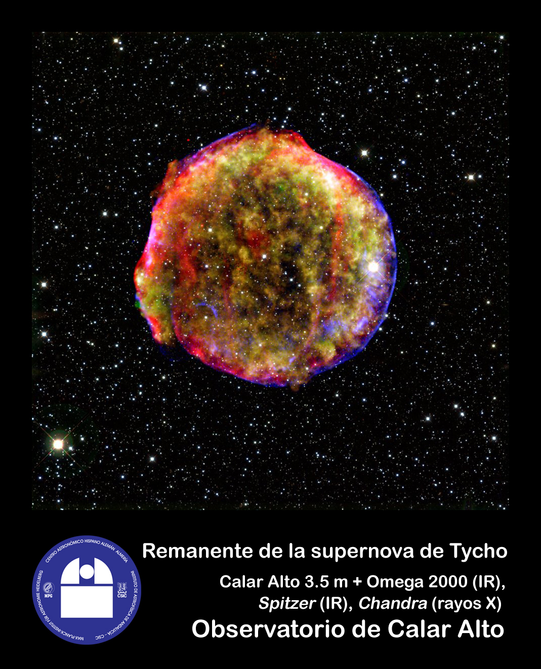 Imagen multi-banda del remanente de la supernova de Tycho, compuesta a partir de imágenes tomadas con el telescopio de 3.5 m de Calar Alto y la cámara Omega 2000 (infrarrojo), el telescopio espacial Spitzer (infrarrojo) y el telescopio espacial Chandra (rayos X).