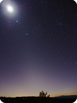 El experimentado astrónomo de Calar Alto Gilles Bergond obtuvo esta fotografía del cometa C/2011 L4 (PanSTARRS) el 18 de marzo de 2013. El cometa se aprecia con claridad cerca del horizonte occidental, arriba a la derecha del extremo superior del árbol. Pero el rasgo más llamativo de esta toma informal lo constituye la claridad y trasparencia sorprendentes del cielo en Calar Alto. La luz zodiacal, piedra de toque de la calidad de cualquier cielo de calidad astronómica, se extiende desde el horizonte y cruza la imagen hacia la esquina superior izquierda, ocupada por la Luna. La luz zodiacal es una nube lenticular de polvo interplanetario que brilla iluminada por el Sol. Esta banda difusa, mucho más débil que la Vía Láctea, solo puede verse bajo los cielos más limpios y su presencia en esta fotografía, incluso con luz lunar moderada, documenta la calidad del cielo en el Observatorio de Calar Alto, situado a 2168 metros sobre el nivel del mar en la Sierra de los Filabres, Andalucía (España).