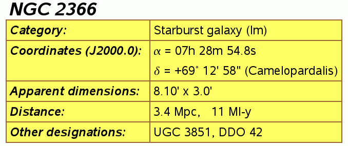 NGC 2366 is a dwarf galaxy placed at a distance of 11 millions of light-years (3.4 millions of parsecs). Its irregular shape and stellar content make it similar to the Magellanic Clouds, the two irregular dwarf galaxies very close to our own. For scale, NGC 2366 is about 20 000 light-years wide, what makes it twice as large as the Large Magellanic Cloud, and four times larger than the Small Magellanic Cloud, but still classified as a dwarf galaxy.