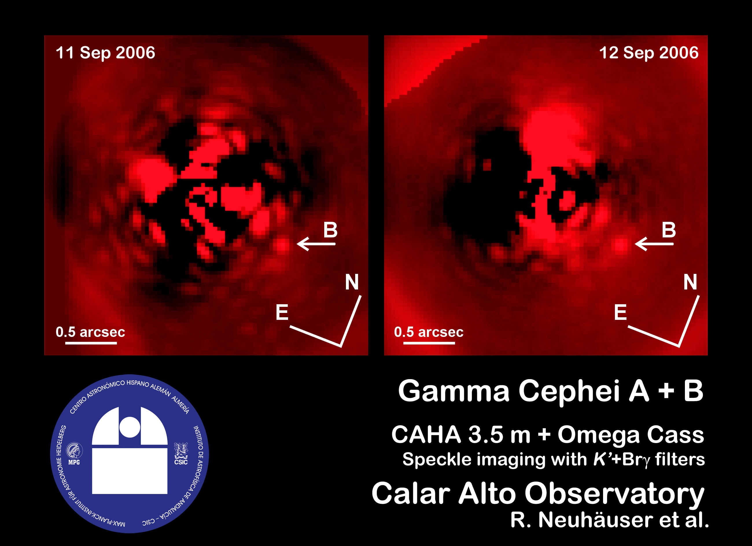 One of their recent findings refers to a quite bright star, gamma Cephei (γ Cephei), a star with a planet (γ Cephei Ab) with a minimum mass 1.7 times that of planet Jupiter and with a period of around 3 years. From previous spectroscopic studies this star is known to also have a low-mass stellar companion (γ Cephei B) orbiting the brighter component. This team has now been able to get the first direct images of the secondary star which allow to significantly improve the determination of physical parameters of the γ Cephei system. The observations were obtained both with the Japanese telescope Subaru (placed at Mauna Kea, Hawaii), and with the instrument Omega-Cass attached to the 3.5 m telescope of Calar Alto (Spain). The observations at Mauna Kea were obtained by Misato Fukagawa (Nagoya University) in June 2006, and at Calar Alto by Markus Mugrauer and Tobias Schmidt (both AIU Jena) in September 2006.