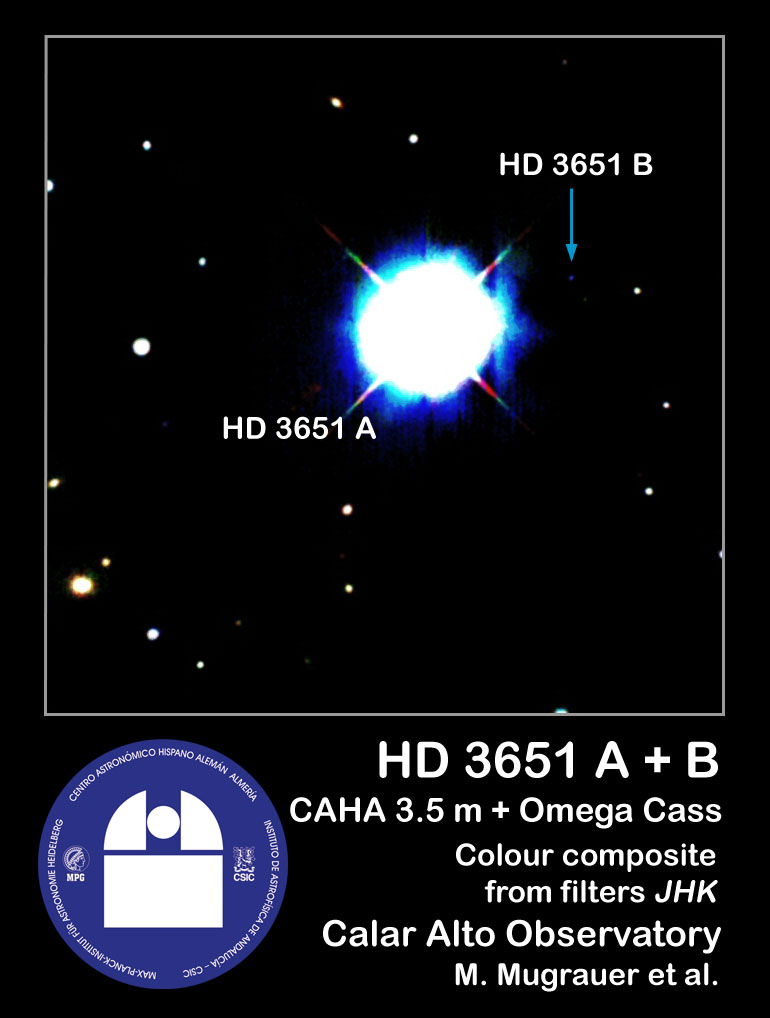 hd3651intext Another outstanding discovery by the same team using Calar Alto telescopes, is that of the companion to the star HD 3651. HD 3651 is a nearby faint, red star, known to have a sub-Saturn-mass planet. This team discovered that the very faint companion is in fact a cool brown dwarf, the first brown dwarf  directly imaged as companion to an exoplanet host star. Observations performed with the instrument Omega-Cass at the 3.5 m telescope of Calar Alto in September 2006, helped to demonstrate the link between HD 3651 and this small substellar object (now called HD 3651 B), and to determine its physical characteristics. The faint companion of the planet host star HD 3651 is one of the coolest brown dwarfs presently known (effective temperature ranging between 500o and 600o C).