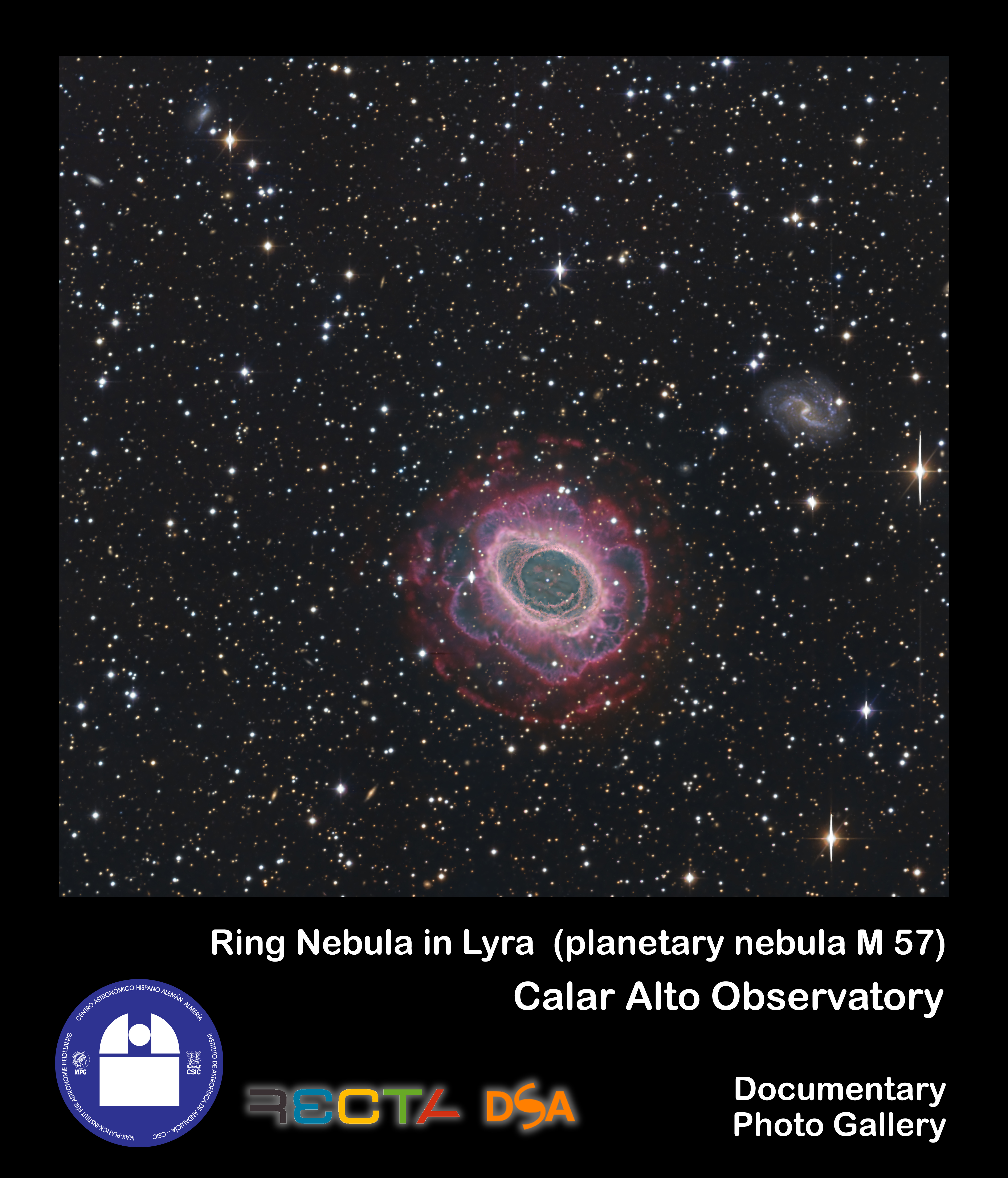 Image of the Ring Nebula in Lyra from the Documentary Photo Gallery of Calar Alto Observatory (CAHA-RECTA-DSA). Vicent Peris (DSA/OAUV), José Luis Lamadrid (DSA/CEFCA), Jack Harvey (DSA/SSRO), Steve Mazlin (DSA/SSRO), Ana Guijarro (CAHA). Image scale: 0.15” per pixel. Compressed version (JPEG). (5.1 MB)