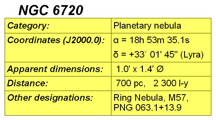 The Ring Nebula is in the northern constellation of Lyra. It was discovered in 1779 by Antoine Darquier de Pellepoix and by Charles Messier. It is included in the catalogue of diffuse objects of this second astronomer, with number 57. This nebula is placed at 2300 light-years from Earth. It seems to have begun to form 2000 years ago and it is expanding at a velocity of 20-30 km per second. The surface temperature of the central white dwarf is about 120 000 degrees Celsius.